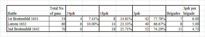 The data for Lutzen shown above is an estimate as the Swedish records simply state 70 guns were present of which 20 were heavy guns but doesn't detail their size. A minimum of three 24pdrs were present as a salvo from three of these opened the Swedish assault.